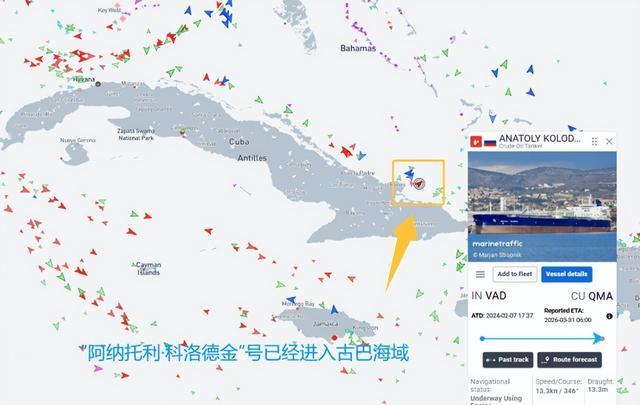 隶属于俄政府的阿纳托利·科洛德金号油轮,满载约73万桶原油,从俄罗斯波罗的海沿岸的普里莫尔斯克港动身,一王人穿英祥瑞海峡、最初大欧好意思,全程有惊无险地驶入古巴海域,最终告成泊岸马坦萨斯港完成卸货。